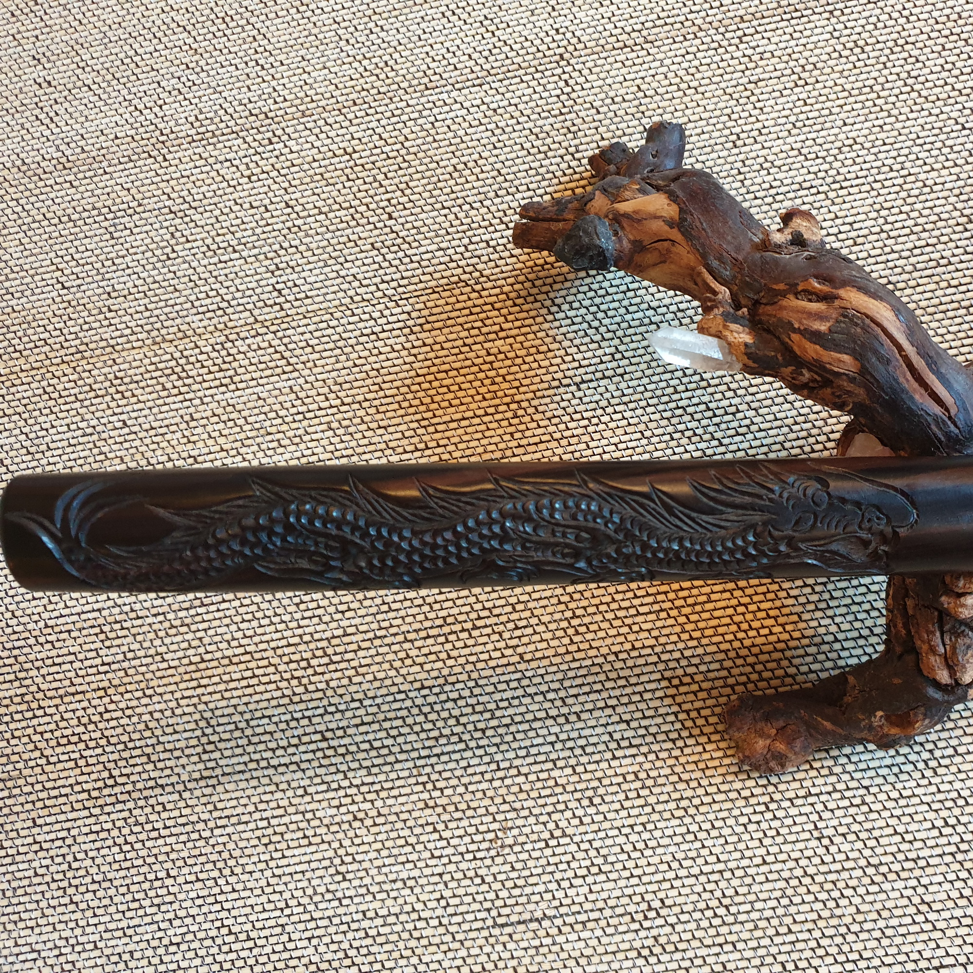 Unseren Drachen-Bokken aus Ebenholz in der Standardform bieten wir Dir auch mit einer BoHi an. Am Griff befindet sich eine wunderschöne Schnitzerei in Form des asiatischen Glücksdrachens.