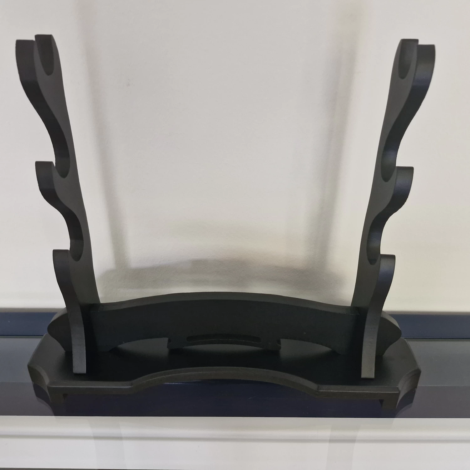 Für die Präsentation deiner Schwerter ist dieser schöne Tischständer für 3 Schwerter aus schwarz lackiertem Holz genau richtig. Auf ihm kannst du 3 Schwert/Katana/Bokken oder auch ein Wakizashi / Shoto gut präsentieren. Die Bodenplatte wird mit der Ablage verschraubt. Er ist leicht zu montieren.