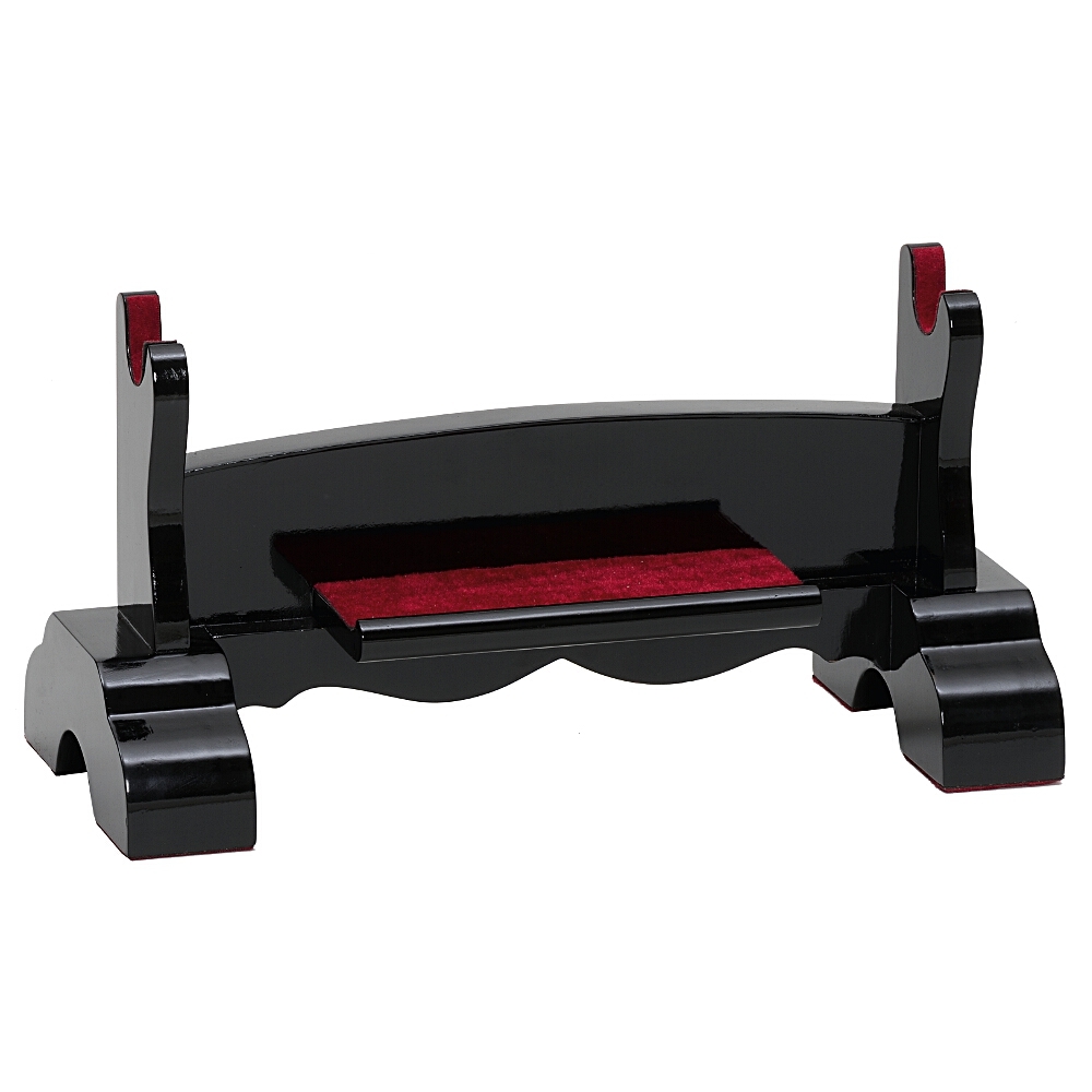 High-quality sword table stand with black high-gloss finish for one katana or one bokken. The sword stand also has a shelf for your tanto. The contact surfaces are covered with velvet.